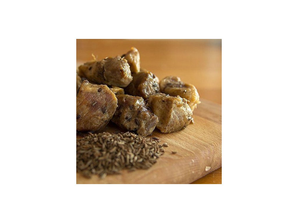 Tak to je opravdu maso! Ručně očištěné a porcované kousky vepřové plece pečené v páře spolu s kmínem. Díky vyššímu obsahu tuku je maso hezky šťavnaté, chutné a ani potom co ztratí pečením třetinu své váhy není vysušené. Malá hmotnost a vysoká výživová hodnota předurčuje použití masa i v případě, že cestujete na lehko.