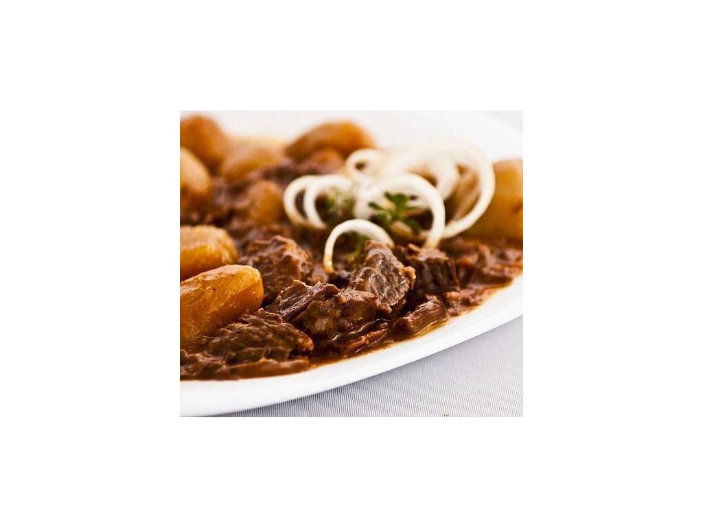 Dobře udělaná klasika nikdy neomrzí. Poctivý gulášek z hovězího předního z býků z volných chovů. Omáčka přesně podle zlatého poměru 2 díly cibule jeden díl masa, zalitá vývarem z kostí zahuštěna bezlepkovou moukou a dokořeněno červenou sušenou paprikou. Příloha jsou vařené bramborové čtvrtky.