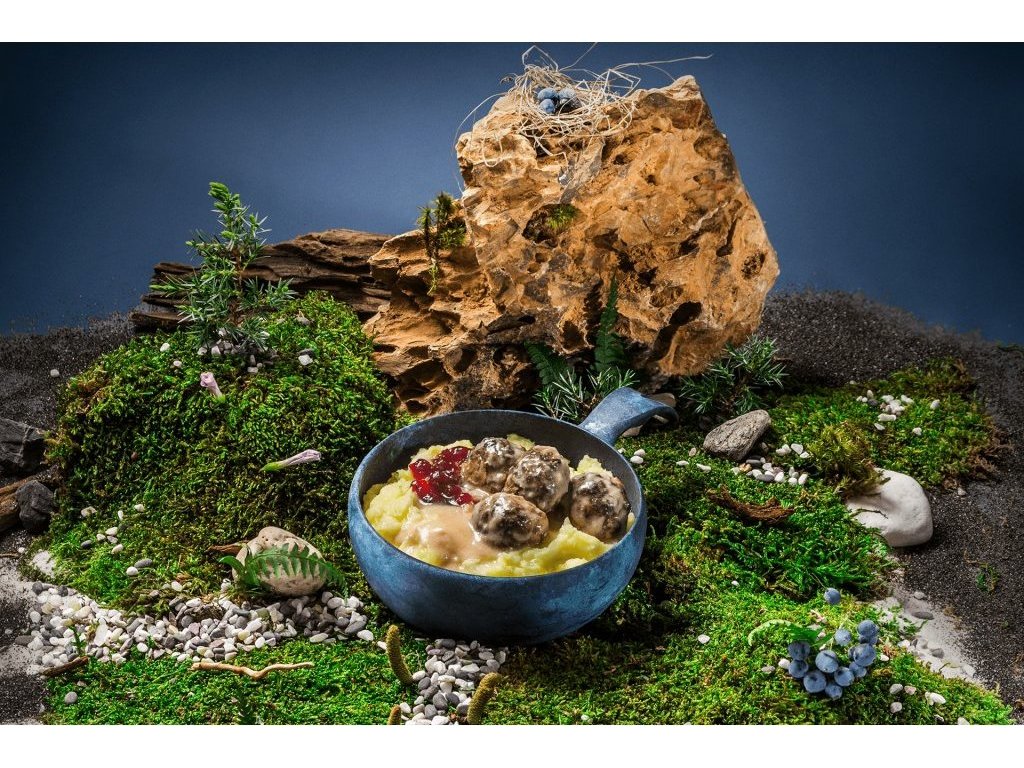 Bramborová kaše (38 %) (brambory, mléko), krémová omáčka (34 %) (smetana, hovězí vývar, zeleninový vývar, máslo (mléko), mouka kukuřičná, mouka rýžová, dijonská hořčice (voda, hořčičné semeno, lihový ocet, sůl), sojová omáčka (pitná voda, sojové boby (24 %) (sója), cukr, sůl, pšeničná mouka), masové kuličky (24 %) (hovězí maso mleté, vepřové maso mleté, cibule, vejce, petrželová nať, kopr, pažitka, libeček, sůl, nové koření, pepř, kardamom), brusinky (4 %).