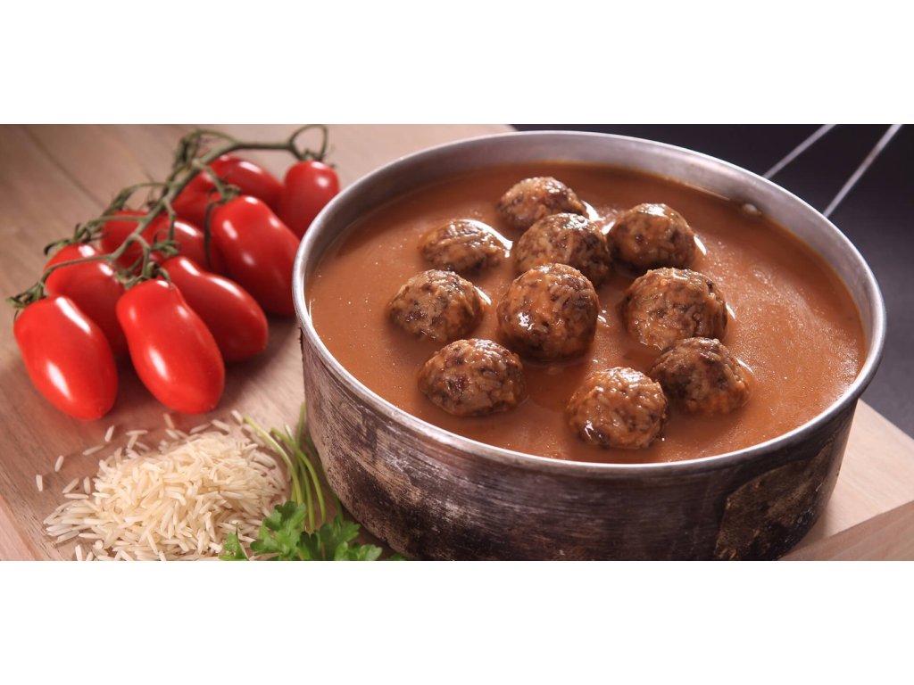 Složení:„masovo-rýžové koule (51%)(hovězí maso mleté(50%), rýže basmati(15%), voda, vejce, olej řepkový, sůl (jedlá kamenná sůl, jodičnan draselný), sušená petržel, pepř), rajská omáčka (49%)(voda, rajský protlak (voda, rajčatový protlak, cukr, sůl), cibule, kořenová zelenina (mrkev,celer, pastinák, petržel) rýžová mouka, kukuřičná mouka, řepkový olej, cukr, citron, sůl (jedlá kamenná sůl, jodičnan draselný), divoké koření.