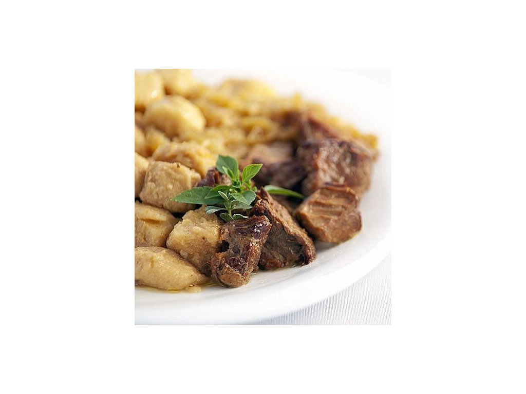 Složení: vepřová plec (30%), bramborové špalíčky(28%) (brambory, mouka pšeničná, pšeničná krupice, vejce, sůl), zelí kysané (26%)(zelí, voda, sůl, kmín), řepkový olej, cibule, mouka rýžová, mouka kukuřičná, cukr, česnek, ocet, sůl, kmín, pepř.