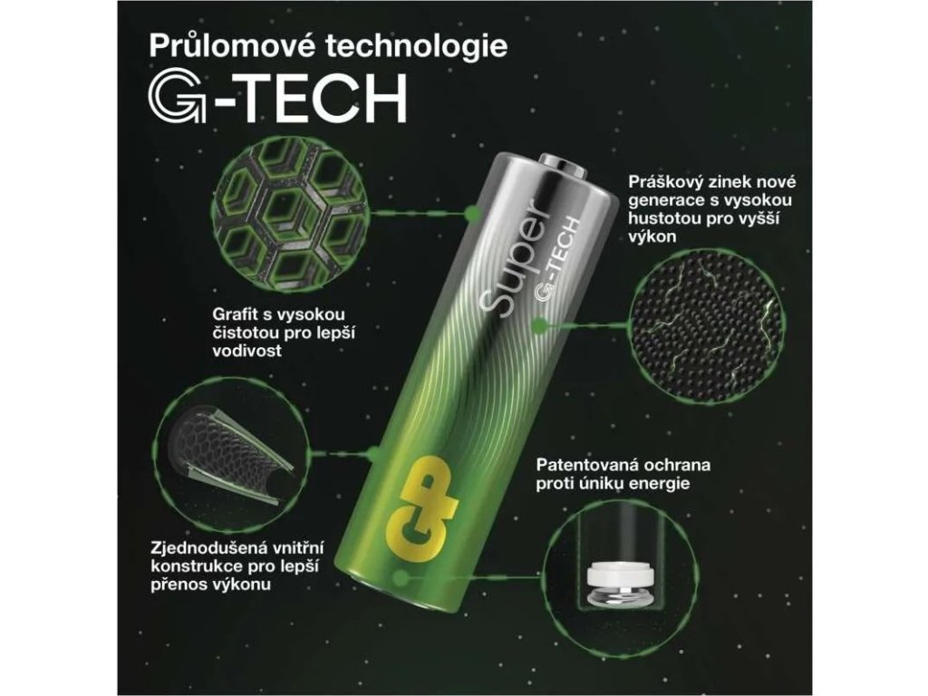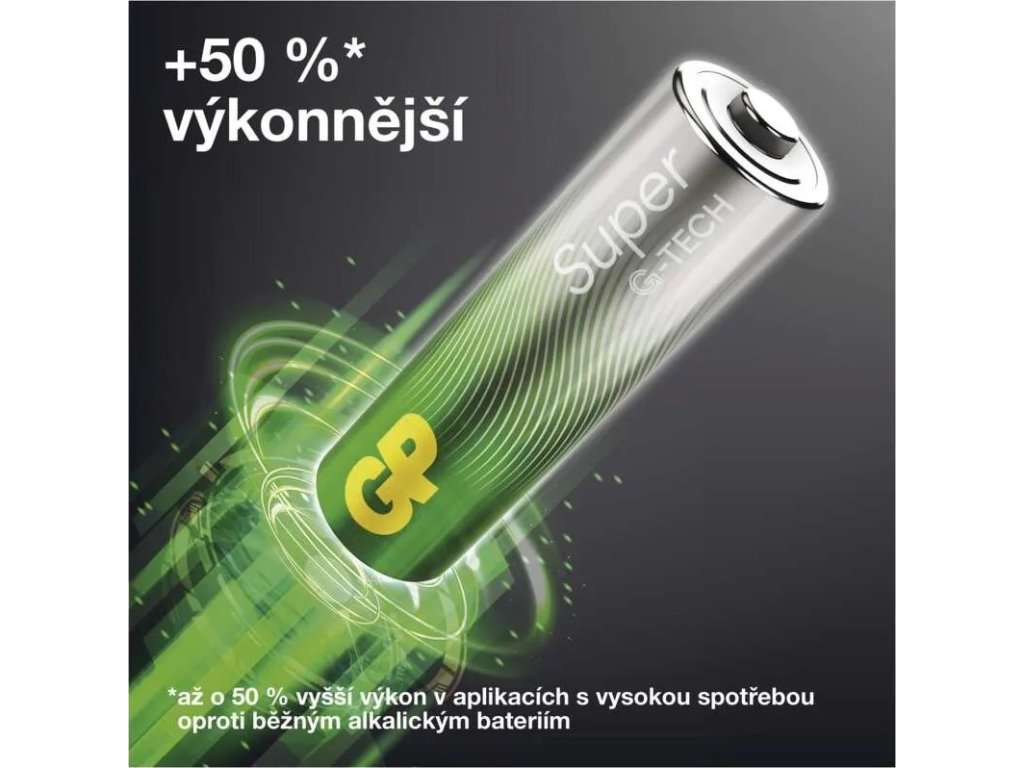 Pokud hledáte baterie, které vám poskytnou spolehlivou a dlouhotrvající energii pro vaše elektronické zařízení, sáhněte po nových alkalických bateriích GP SUPER, které jsou vybaveny revoluční technologií G-TECH s výdrží o 50 % větší oproti ostatním alkalickým bateriím.