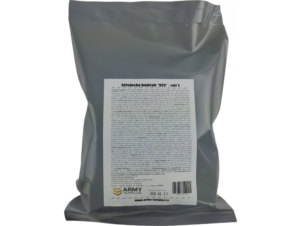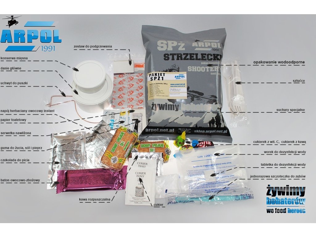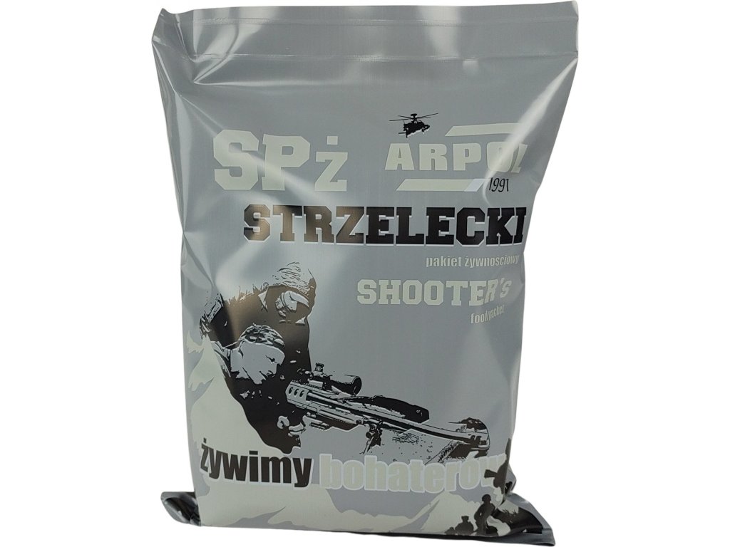 Bohatě vybavený a kvalitní potravinový příděl jednotlivce, ideální nejen pro klasické lovce, hobby střelce a profesionální odstřelovače: Tyto střelecké balíčky "Strzelecki pakiet żywnościowy SHOOTER´S food packet- SPŻ" jsou vyrobeny zakázkově z prvotřídních surovin pro naší společnost renomovaným polským výrobcem ARPOL®.