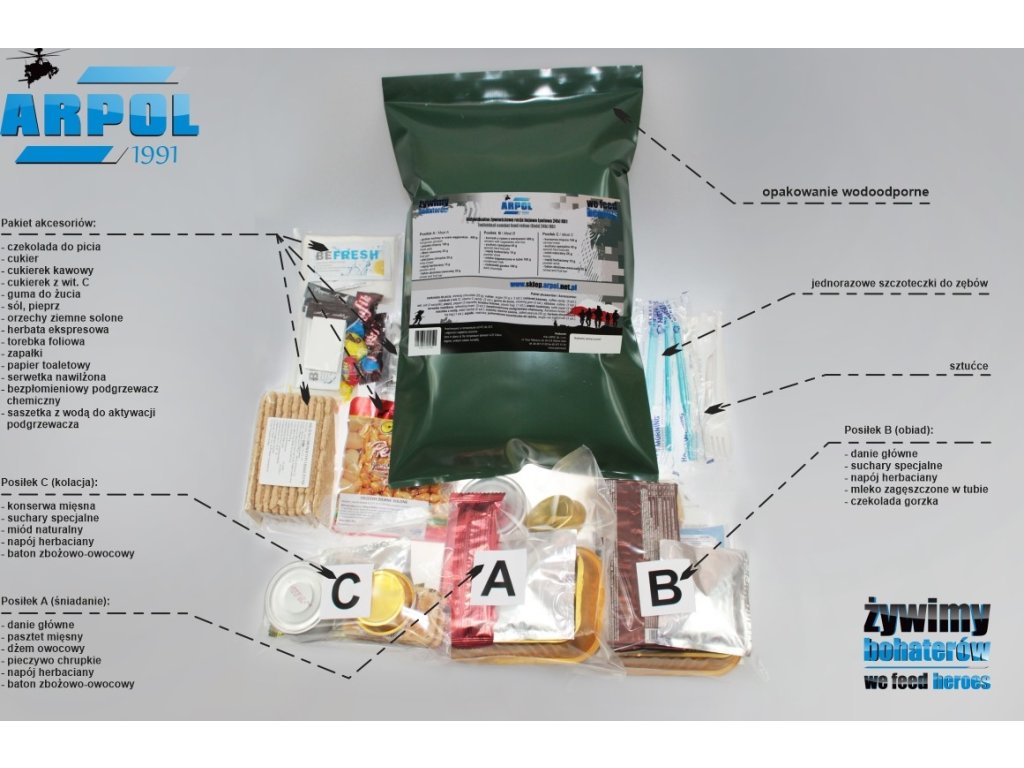 Tyto vojenské balíčky, neboli potraviny vojenských hrdinů "Indywidualna żywnościowa racja bojowa (polowa 24h) RB" jsou vyrobeny zakázkově z prvotřídních surovin pro naší společnost renomovaným polským výrobcem ARPOL®.