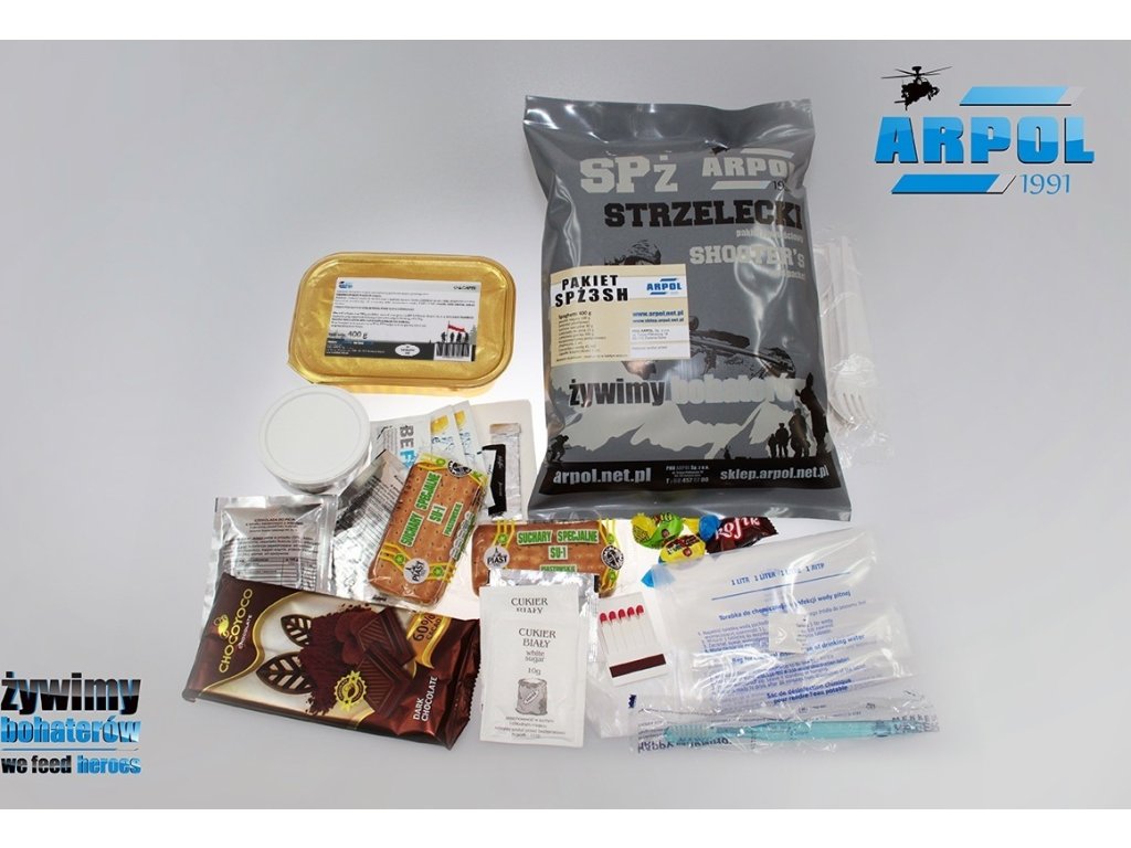 Bohatě vybavený a kvalitní potravinový příděl jednotlivce, ideální nejen pro klasické lovce, hobby střelce a profesionální odstřelovače: Tyto střelecké balíčky "Strzelecki pakiet żywnościowy SHOOTER´S food packet- SPŻ SH" jsou vyrobeny zakázkově z prvotřídních surovin pro naší společnost renomovaným polským výrobcem ARPOL®.
