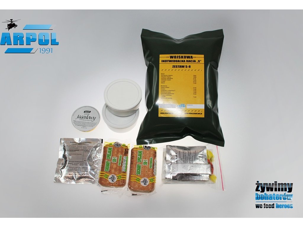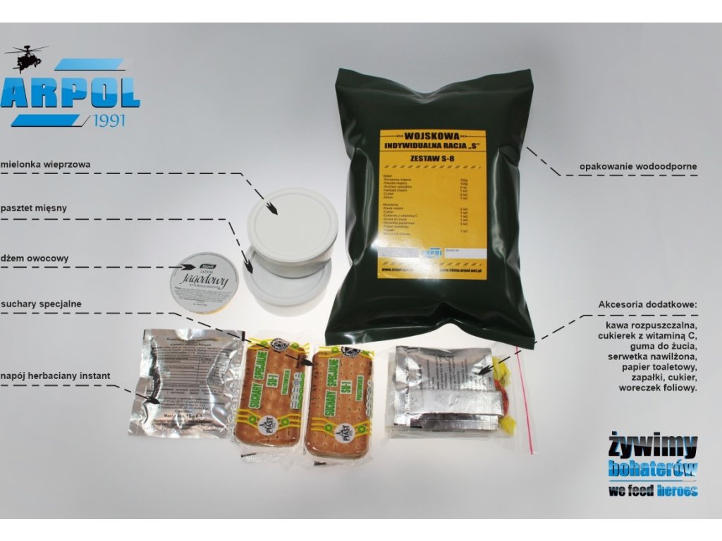 Kvalitní potravinový příděl suchých potravin na cesty: Individuální vojenská dávka "S" , vyrobený zakázkově z prvotřídních surovin pro naší společnost renomovaným polským výrobcem ARPOL®.
