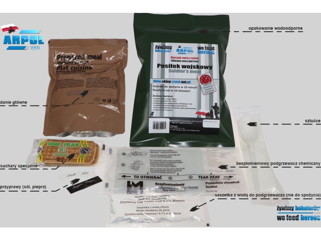 Kvalitní potravinový příděl na cesty: P/W - "Posiłek Wojskowy", vyrobený zakázkově z prvotřídních surovin pro naší společnost renomovaným polským výrobcem ARPOL®.