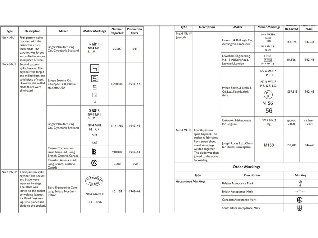 Celkem bylo během 2. světové války vyrobeno zhruba 5 milionů bajonetů č. 4 všech značek. Protože výroba bajonetu č. 4 byla jednoduchá a ve vládních zbrojních továrnách Spojeného království nebyla žádná volná výrobní kapacita, byla místní výroba ve Spojeném království zadávána soukromým společnostem, které obvykle zbraně nevyráběly. Prvním výrobcem bajonetů č. 4 byla pobočka Singer Manufacturing Company v Clydebank u Glasgow ve Skotsku. Singer běžně vyráběl šicí stroje. Singer byl první firmou, která měla kontrakt na výrobu bajonetů č. 4 a vyrobila bajonety č. 4 mk I a č. 4 mk II. Bajonet č. 4 mk I vyráběl výhradně Singer v relativně malém množství, vyrobili jich jen 75 tisíc. Dalšími výrobci bajonetu č. 4 mk II byli v zahraničí, korporace The Crown Corporation Small Arms Limited se sídlem v Long Branch v Torontu v Kanadě a Savage Arms z jejich zařízení v Chicopee, Massachusetts ve Spojených státech. Korunní korporace Small Arms Limited byla kanadským vládním výrobcem zbraní a Savage Arms, která také vyráběla pušky Lee Enfield č. 4 mk I, vyráběla bajonet č. 4 mk II, který poskytla Spojenému království v rámci Lend-Lease. Celkově tito tři výrobci vyrobili zhruba jeden milion bajonetů, z nichž každý vedlo k hrubému celkovému počtu asi 3 milionů vyrobených bajonetů č. 4 mk II, což je více než polovina výroby bajonetů č. 4. Výroba bajonetů č. 4 mk II* a č. 4 mk III byla provedena ve Velké Británii. No. 4 mk II* vyráběly čtyři společnosti, z nichž tři byly v Anglii, a to Prince-Smith & Stells v Keighley, Yorkshire, Howard & Bullough v Accringtonu, Lancashire, Lewisham Engineering v Ladywell, Londýn a jedna v Severním Irsku, Baird Manufacturing z Belfastu. Normálně Prince-Smith & Stells a Howard & Bullough vyráběli průmyslové stroje a Lewisham Engineering byl založen výhradně na výrobu bajonetů. Bairdova výroba před válkou dělala strojírenství. Zhruba 1300000 bajonetů No 4 mk II* vyrobila většina Smith & Stells, kteří vyrobyly milion a ostatní výrobci zhruba 100 000 každý. Bajonet č. 4 mk III byl vyroben v relativně malých množstvích jedním výrobcem, Joseph Lucas Limited v Chester Street, Birmingham. Vyrobyly jich asi 200 tisíc. Joseph Lucas před válkou vyráběl automobilové komponenty.