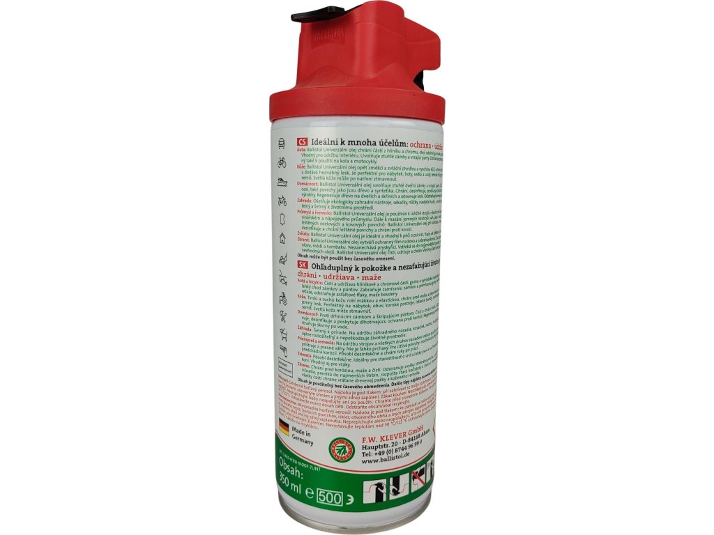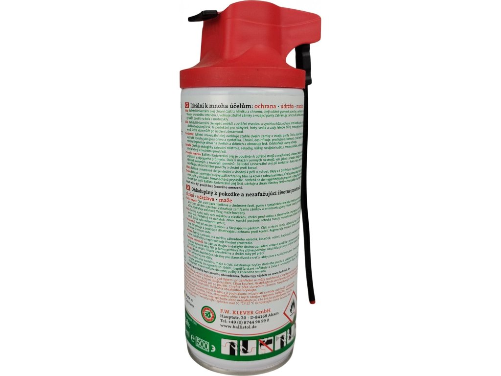 BALLISTOL® Univerzální speciální olej VarioFlex čistí a konzervuje zbraně jako celek – kov, dřevo i další materiály, odstraňuje usazeniny olova, mědi a tombaku v hlavni, neutralizuje kyselé splodiny po hoření prachu. Ballistol neškodí, ale pěstuje lidskou pokožku. Spray s pohyblivým dávkovačem VarioFlex, pouhým pootočením trysky lze přepnout na stříkání hadičkou nebo tryskou.