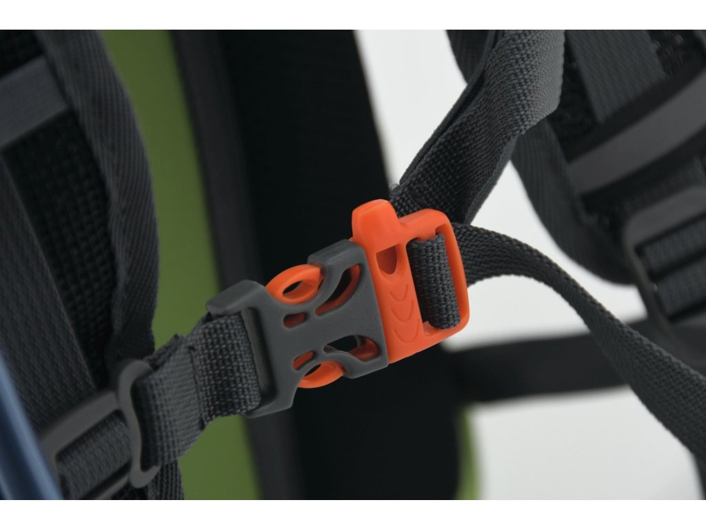 - Zadová část je větraná. Měkké výztuže zajišťují vysokou míru komfortu nošení. Samozřejmostí je zapínání přes hruď, které je klipsové a je doplněné o integrovanou píšťalku. Další předností batohu je i ovládání zipů, které je možné i v cyklistických rukavicích.