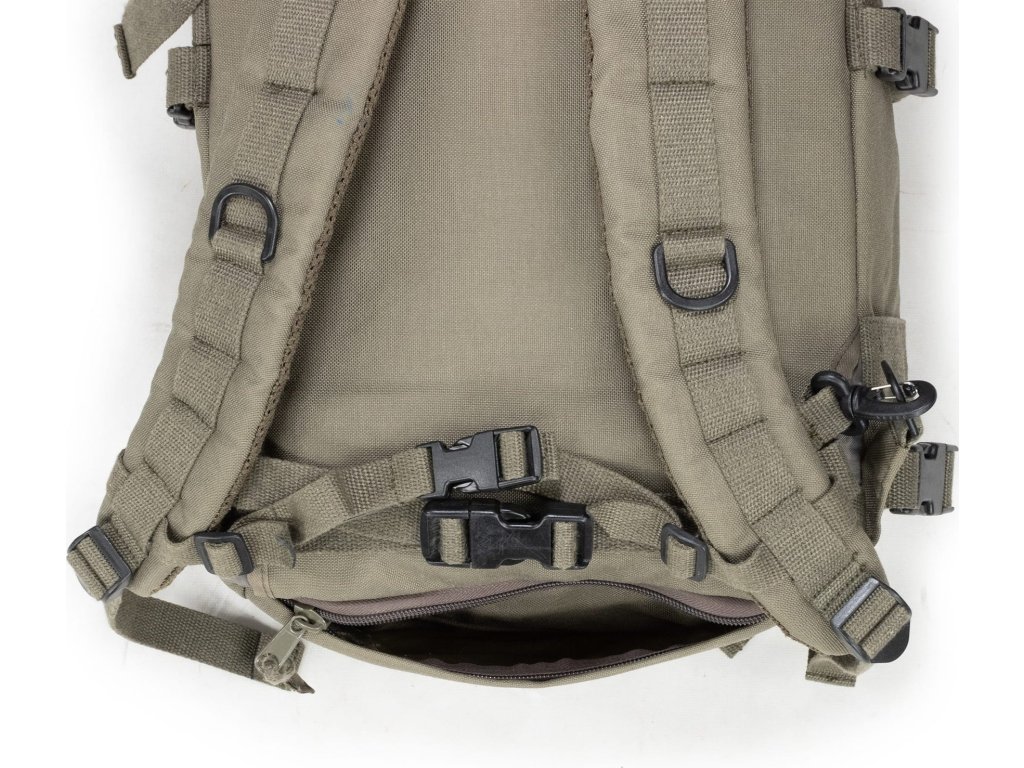 - Vnější strany batohu s univerzální upínací vazbou umožňující uchycení různého vybavení (obdoba systému ALICE nebo Molle) a příslušenství dle potřeb uživatele, kapacita batohu lze díky tomuto systému snadno rozšířit uchycením přídavných kapes (kapsy nejsou součástí).