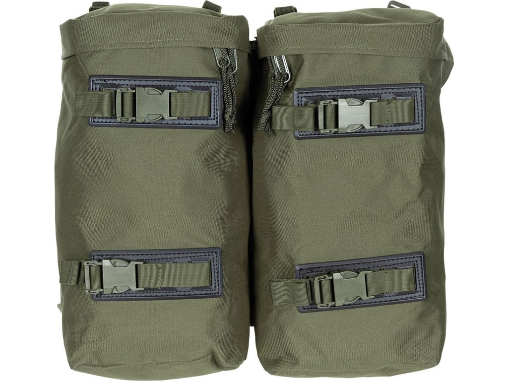 - 2x Velká kapsa se zapínáním na zip po obou stranách batohu, kapsa je připnutá pomocí zipu a je možné ji odepnout, po odepnutí je možné tyto kapsy spojit k sobě pomocí zipu, a vytvořit tak menší batoh (na každé kapse je na zadní straně 1x ramenní popruh).