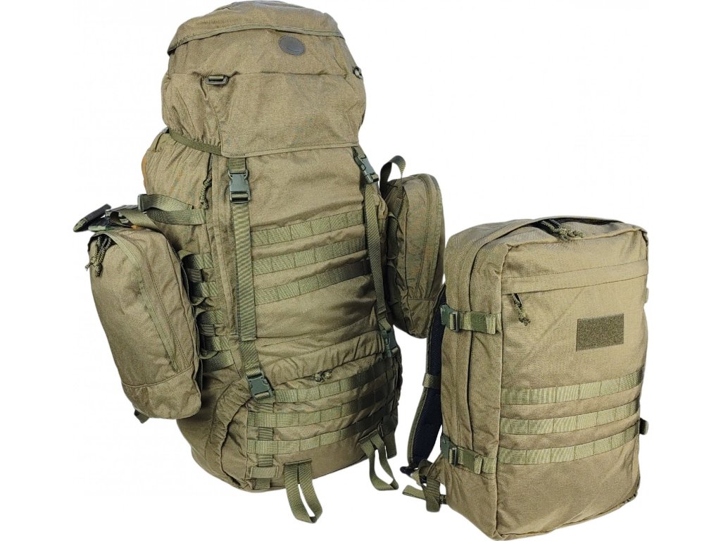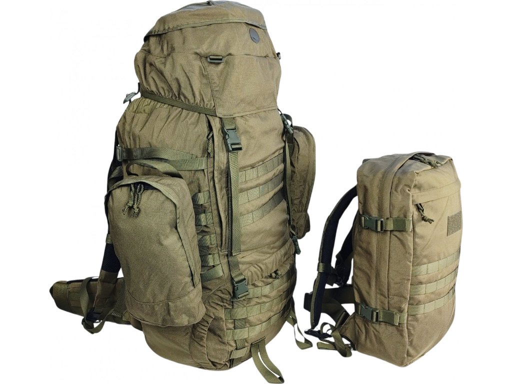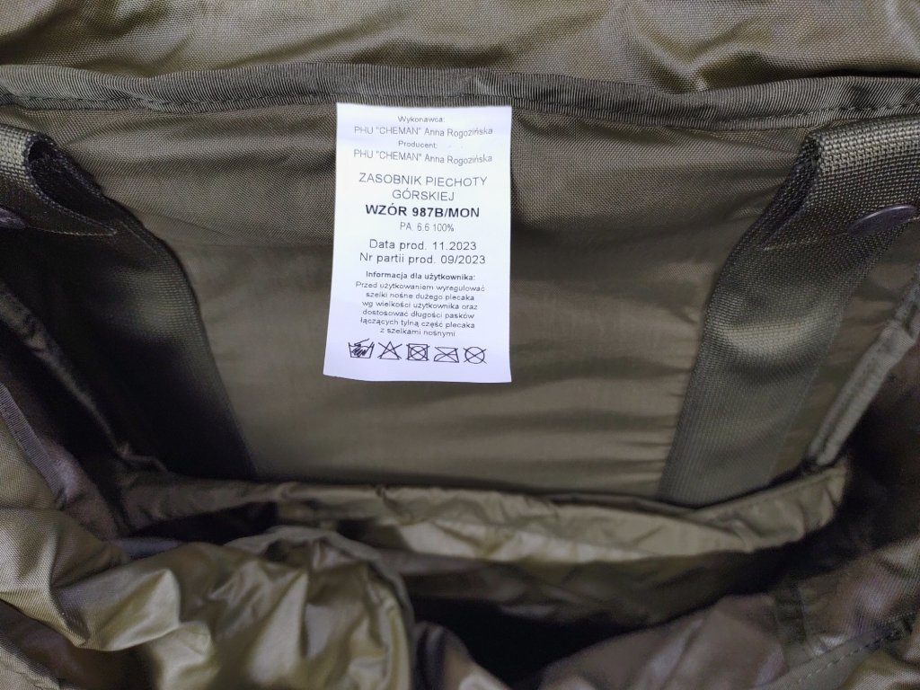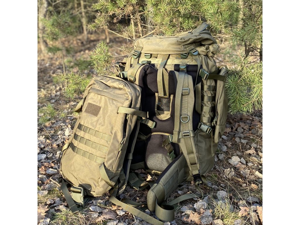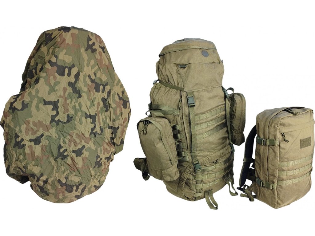 Extra kvalitní batoh polské horské pěchoty známý pod oficiálním názvem "ZASOBNIK PIECHOTY GÓRSKIEJ 987B/MON", z odolného nylonu jednobarevného, světle zelené odstínu khaki. Jde o kompletní soupravu jednotlivce, obsahující hlavní velkokapacitní batoh včetně 2 odepínatelných kapes MOLLE, jednodenní malý batoh, kamuflážní nepromokavý obal v lesním potisku Wz.93 Panhera (určený pro velký batoh nebo pro velký a malý batoh spojený dohromady) .