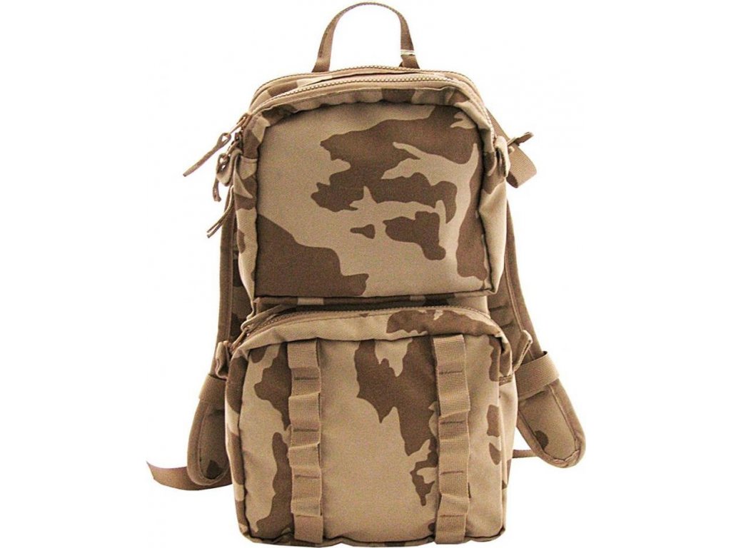 Malý batůžek v pouštním béžovém potisku vzoru 95 AČR. Tento menší batoh obsahuje hydratační vak renomované značky CAMELBAK o objemu 3 litry. Bez vložky skvěle poslouží jako kompaktní jednodenní batoh. Jde o nové, nepoužité, dlouhodobě skladované zboží, vyřazené z armádních zásob.