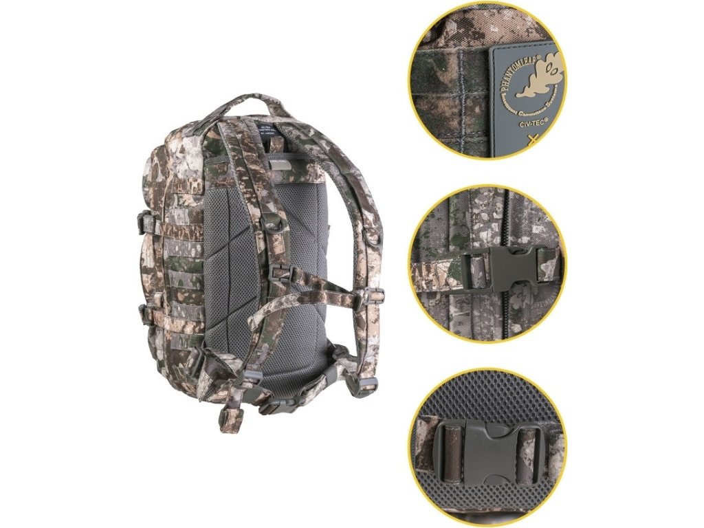 Tento klasický vojenský batoh německé značky Mil-Tec® je vyroben z extrémně odolného polyesteru, a lze jej značně rozšířit o další kapsy pomocí systému Molle. Tři různé maskovací vzory PhantomLeaf® WASP I CIV-TEC® byly vyvinuty exkluzivně pro Mil-Tec®, a jsou kompletně maskované kromě zipu, plastových dílů a síťované ventilace.