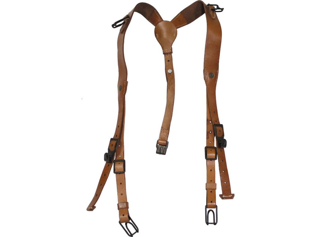 Součástí batohu jsou celokožené kšandy s kovovými háčky.