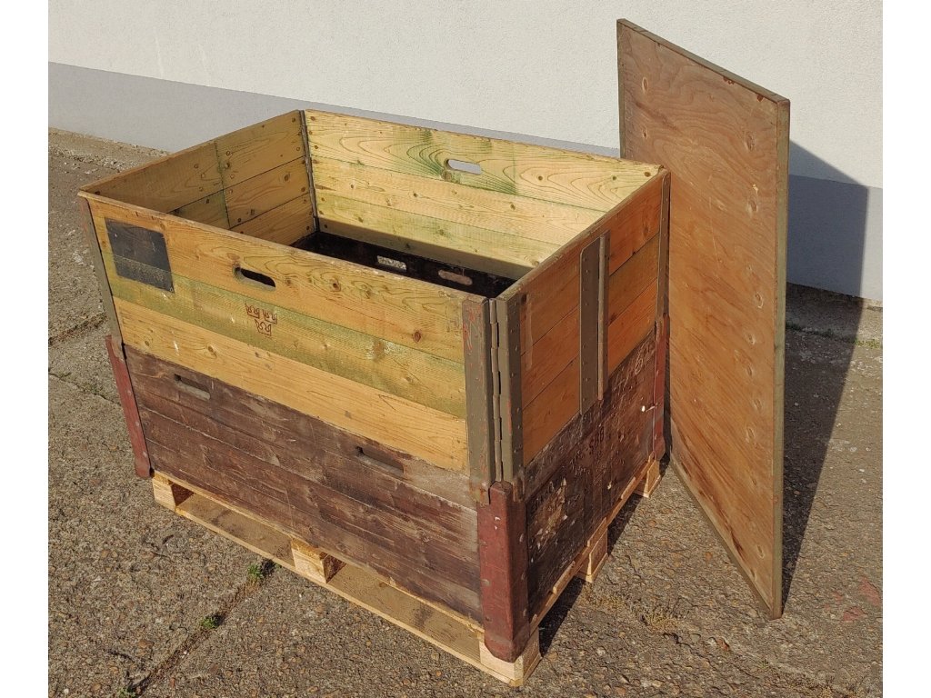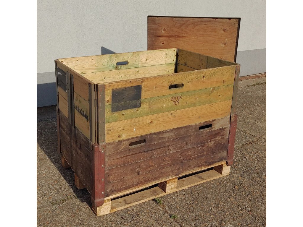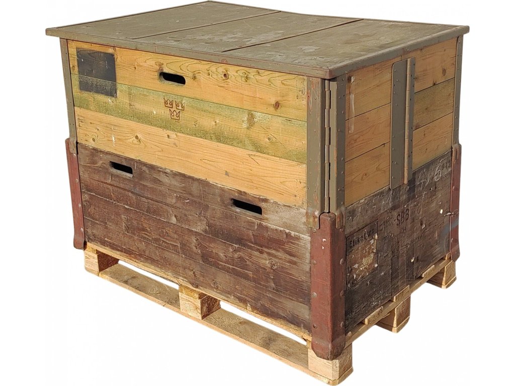 Skládací dřevěný box ze zásob obraných sil Královské armády Švédska. Jde o originální skladovací paletové bedny s pokládacím horním víkem bez pantů, skládací dvoudílné dřevěné konstrukce s robustním kováním, včetně palety pro přepravu a manipulaci. Každá jednotlivá řada váží přibližně 24 kg, dohromady tedy tento box včetně víka a palety váží okolo 58 kilogramů, ale díky rozkládací konstrukci se prázdná snadno přenáší.
