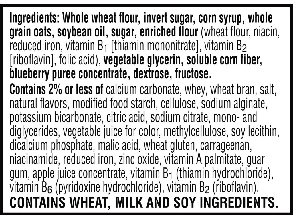 - Borůvková náplň (43 %) (jablečné pyré, glukózový sirup, zvlhčovadlo {glycerol}, borůvkové pyré (5 %), regulátor kyselosti {kyselina citronová}, přírodní aroma, koncentrát z černé mrkve, hroznový koncentrát), obilné mouky (31 %) (celozrnná, ovesná, pšeničná), cukr, rostlinné oleje (palmový, slunečnicový), invertní cukrový sirup, dextróza, uhličitan vápenatý, sušené odstředěné mléko, sůl, stabilizátor (methylcelulóza), kypřicí látka (hydrogenuhličitan draselný), emulgátor (sójový lecitin), niacin, železo, vitamín B6, riboflavin, thiamin, kyselina listová, vitamín B12.