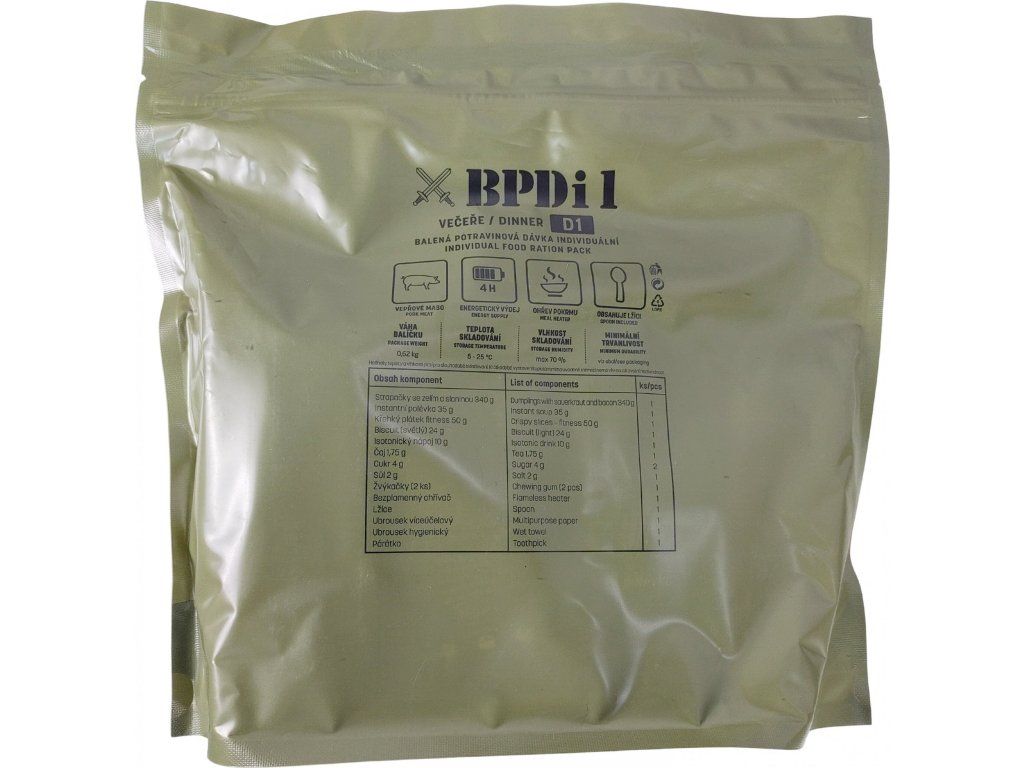 D1 (BPDi1) večeře (dinner), což je balená potravinová dávka pro jednotlivce (individual food ration pack). Jedná se o koncept vojenské potravinové dávky, který splňuje dietní potřeby Armády České republiky (AČR).