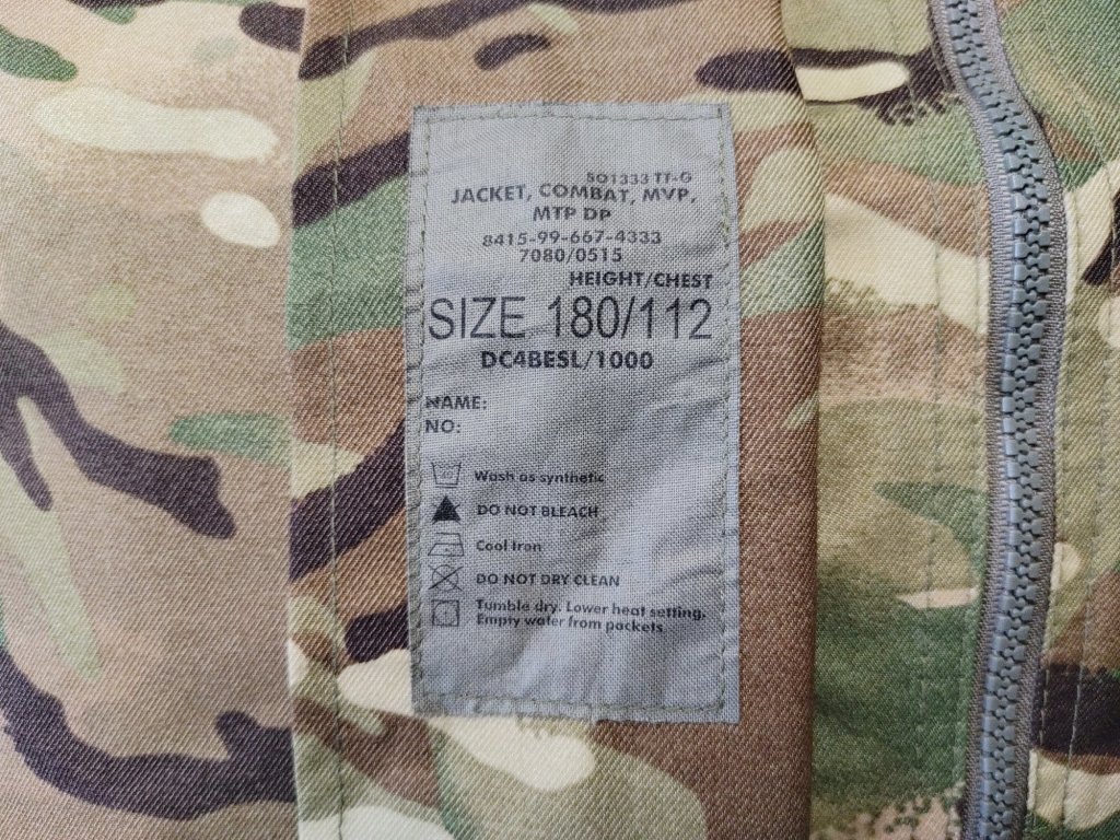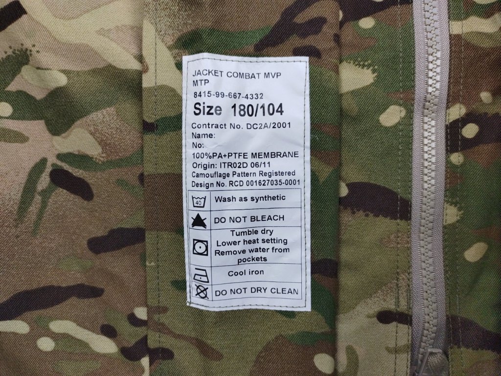 Oficiální skladovací popis: Bunda, Combat, Wet Weather, MVP, MTP. Voděodolná a prodyšná. Zapínání s ochranou proti bouřce. Přední hodnostní popruh. Připojená kapuce schovatelná do límce. Pro nošení s kalhotami TROUSERS, WET WEATHER, MVP, MTP (8415-99-667-4344 až 8415-99-667-4352).