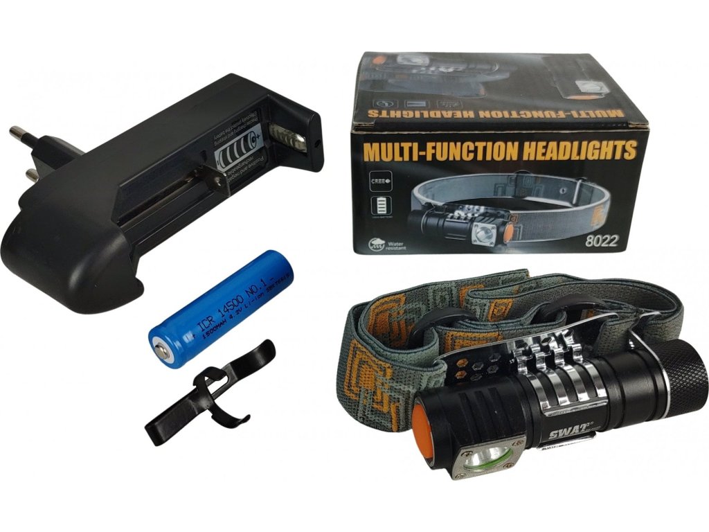 Čelovka multifunkční LED Cree IPX-8 taktická svítilna s klipem a nabíječkou do sítě HT-3413
