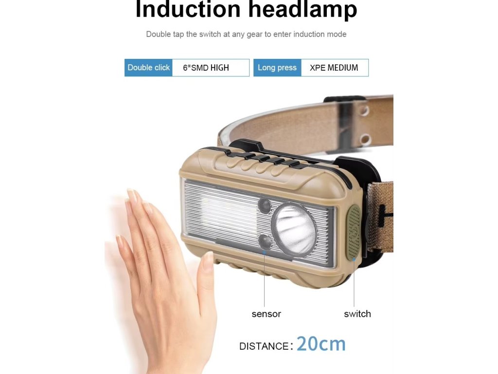 Indukční senzor pohybu poskytne komfort používání výrobku, stačí přiložit ruku ke svítilně do vzdálenosti 20 cm, když chcete čelovku zapnout nebo vypnout, aniž byste museli mačkat vypínač. Stačí přidržet tlačítko označené k zapnutí a aktivovat senzor. Stejným tlačítkem jej můžete vypnout. Krátkým zmáčknutím tlačítka je věnováno ruční změně režimů.