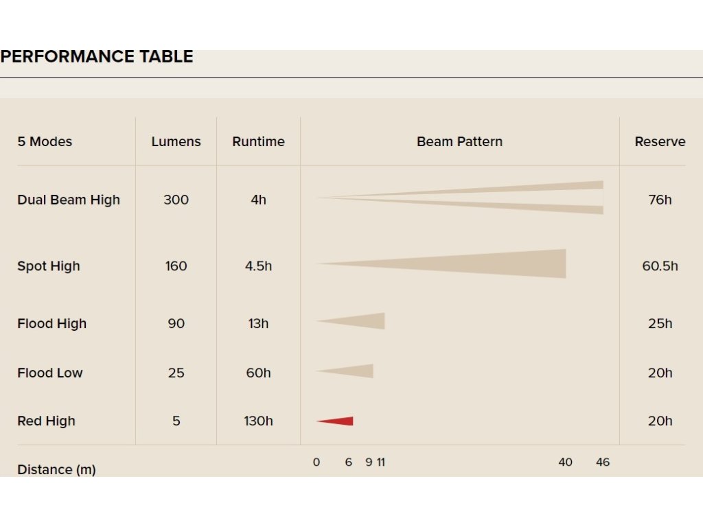 - bilá bodová + rozptýlená 300lm (4 hodiny, 46 metrů)