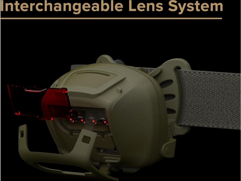 Díky systému vyměnitelných čoček nabízí tato čelovka Princeton Tec Quad výběr bílého nebo červeného světla.