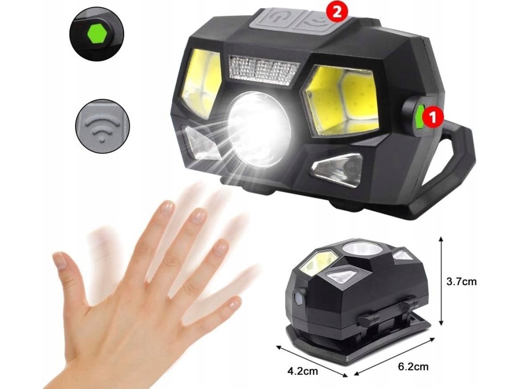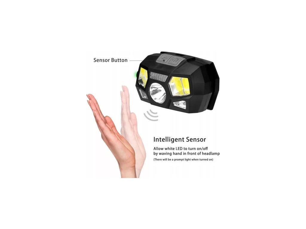 Indukční senzor pohybu poskytne komfort používání výrobku, stačí přiložit ruku ke svítilně, když chcete čelovku zapnout nebo vypnout, aniž byste museli mačkat vypínač. Stačí zapnout tlačítko označené „senzor“ a aktivovat senzor. Stejným tlačítkem jej můžete vypnout. Druhé tlačítko je věnováno ruční změně režimů.