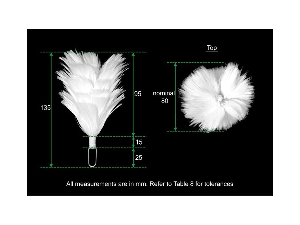 - Peří - Husí peří obarvené na bílo, odstín odpovídá standardnímu vzoru.
