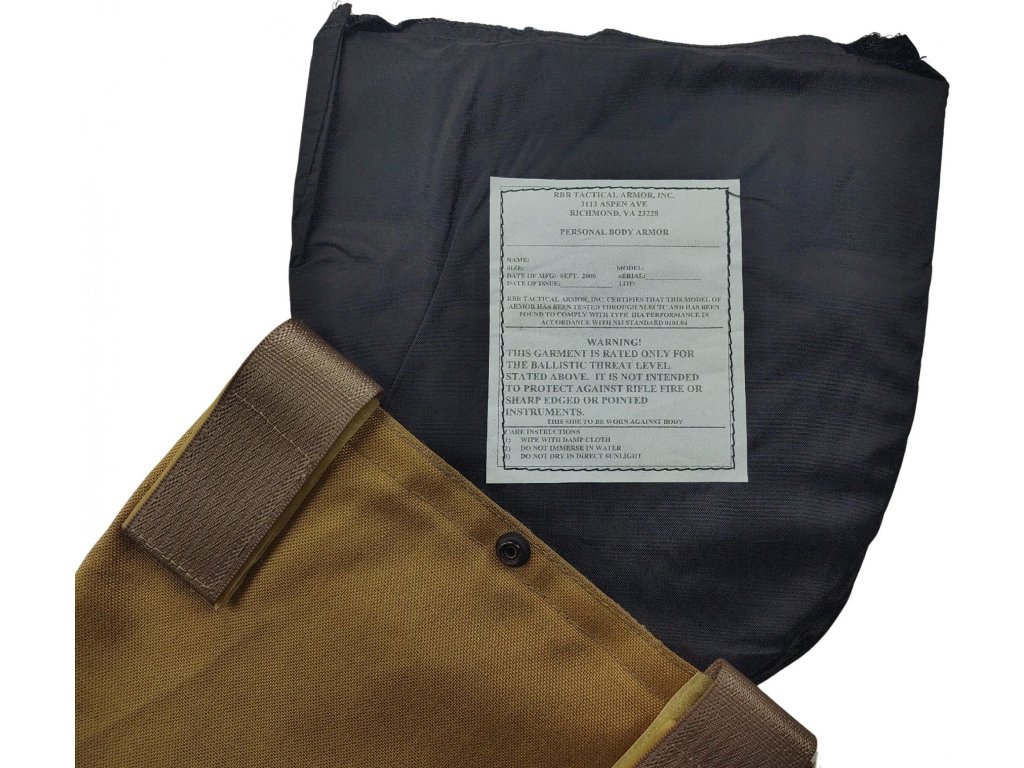 Chránič je vyroben z odolného nylonu Cordura®, který je odolný proti oděru a má vodoodpudivou úpravu. Uvnitř chrániče je vsunuta měkká balistická vložka z kevlarového vlákna, avšak s prošlou expirační dobou - bez garance původních vlastností balistické ochrany.