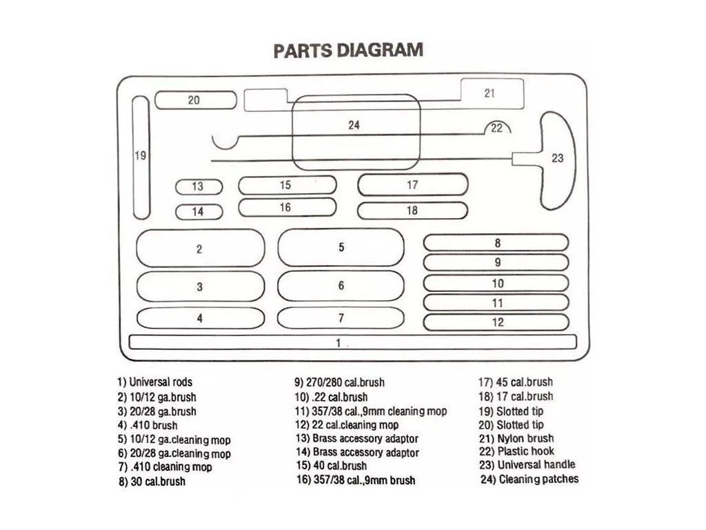 - univerzální 24-dílná sada čisticího příslušenství pro použití na všechny typy čištění pušek a pistolí