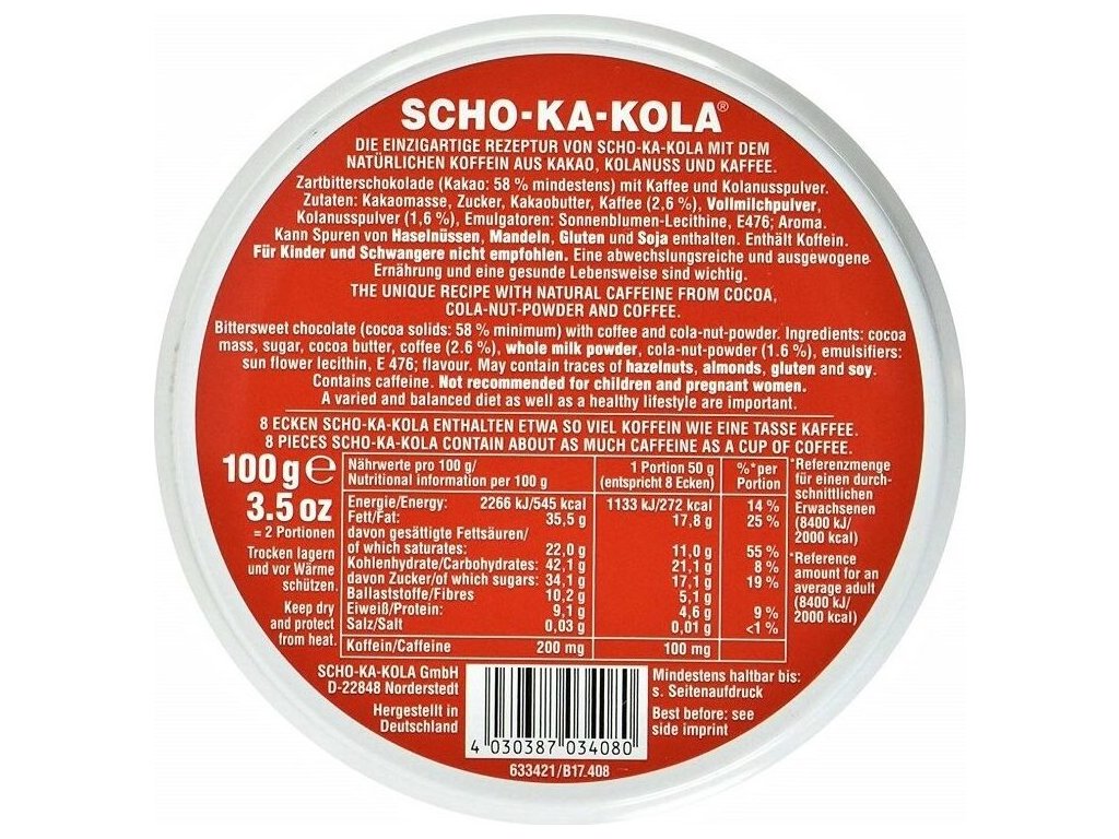 Scho-ka-kola, tradiční německá energetická čokoláda, je ideálním povzbuzujícím prostředkem pro všechny, kteří občas potřebují rychlou dávku energie a svěžesti. Již od roku 1935 dodává sílu a bdělost sportovcům, vojákům, studentům a řidičům. Její přírodní složení s vysokým obsahem kakaa, kávou a výtažkem z kolového oříšku přináší organismu povzbuzení bez nežádoucích vedlejších účinků. Ideální na dlouhé cesty autem, noční učení před zkouškou, cyklovýlety nebo horolezecké výstupy. Všude, kde potřebujete energii, je Scho-ka-kola tou pravou volbou!