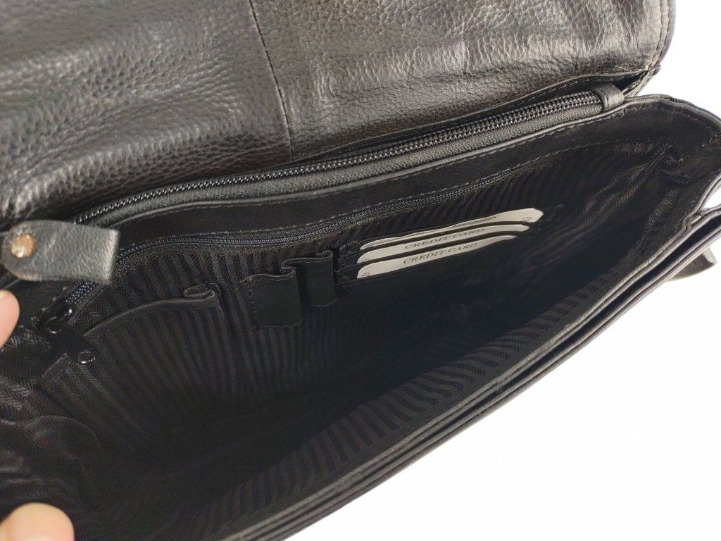 - Vnitřní prostor dělený na tři zasouvací přihrádky a jednu přihrádku na zip, uvnitř jedné z přihrádek je organizér na psací potřeby, karty a drobnosti, a další kapsička na zip.