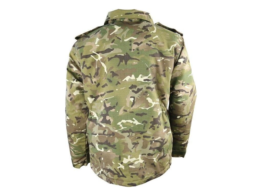 Design a materiál:Bunda je vyvedena v maskovacím vzoru (DPM nebo BTP) a je vyrobena z odolné RipStop polybavlny (65 % polyester, 35 % bavlna), s bavlněnou vnitřní podšívkou a polyesterovou výplní pro teplo.