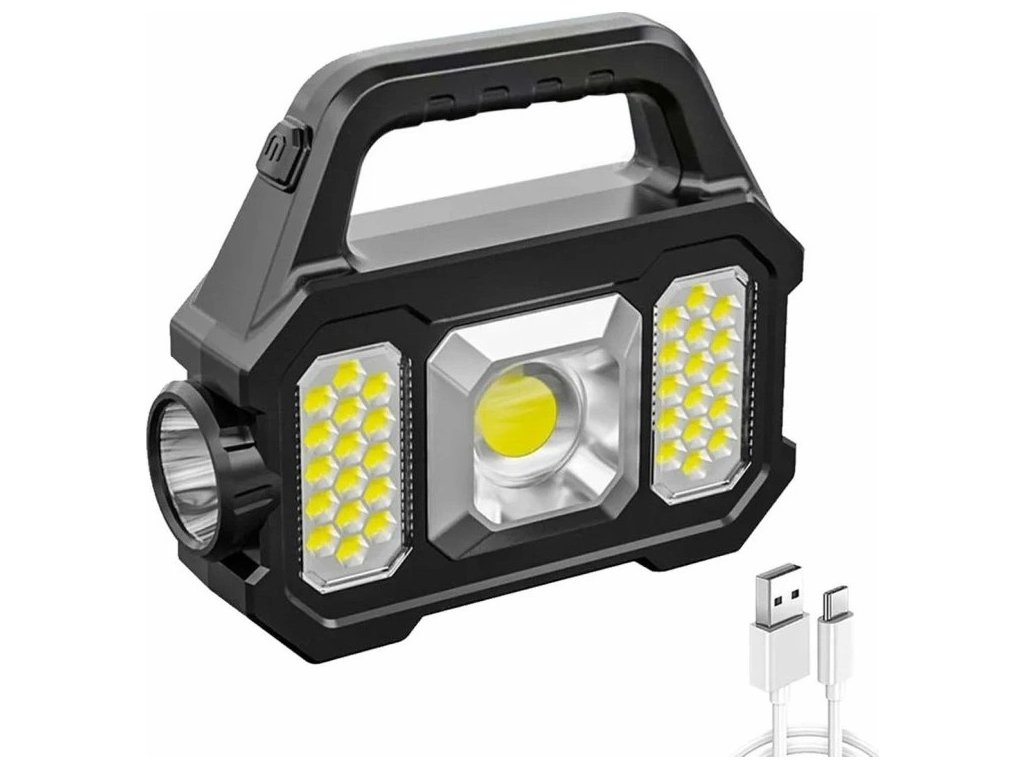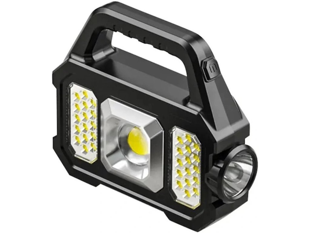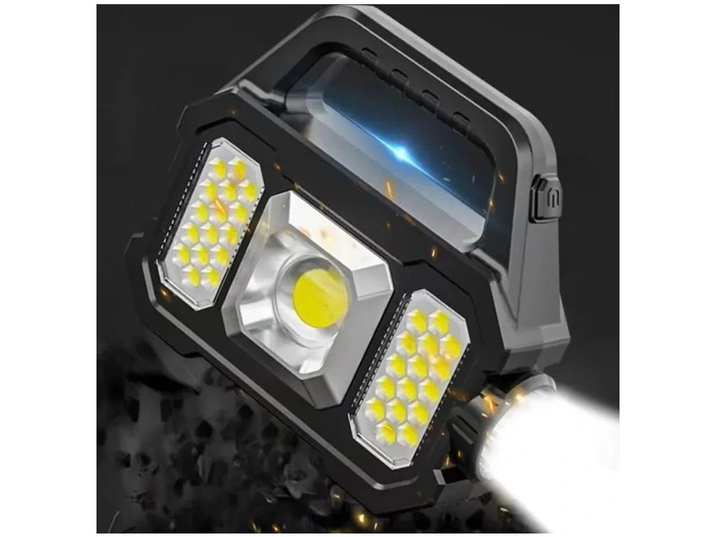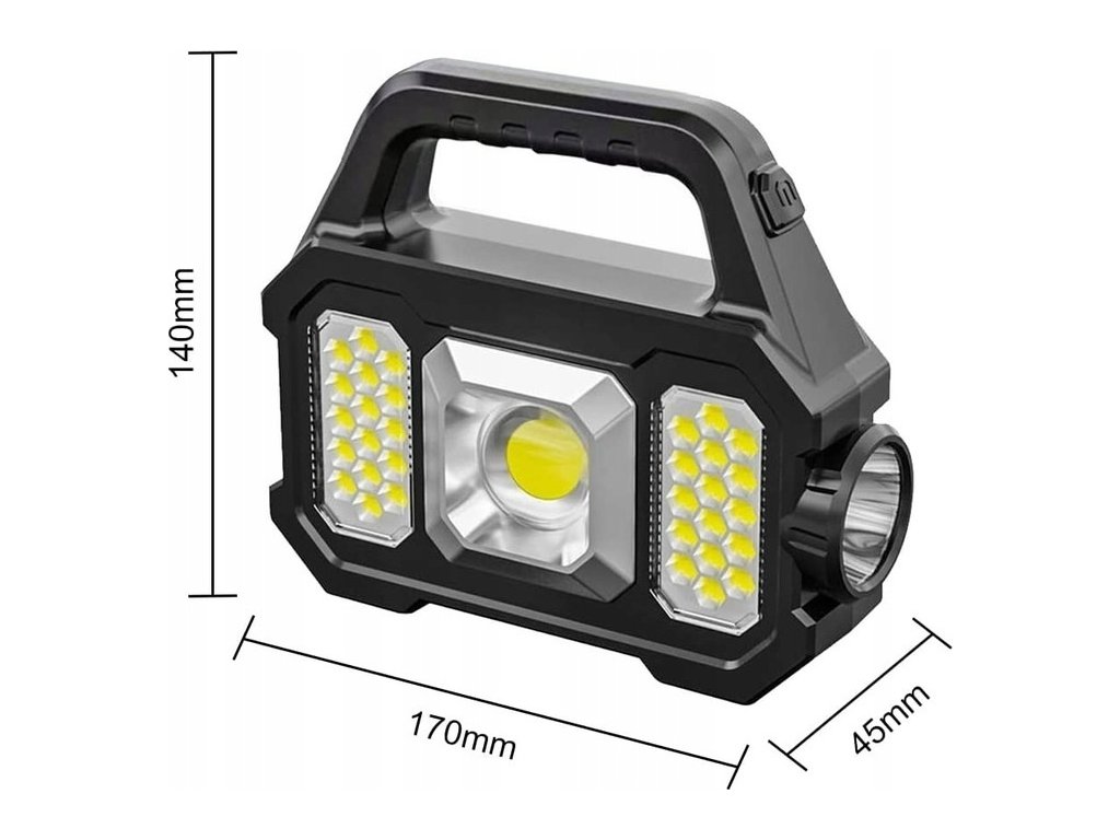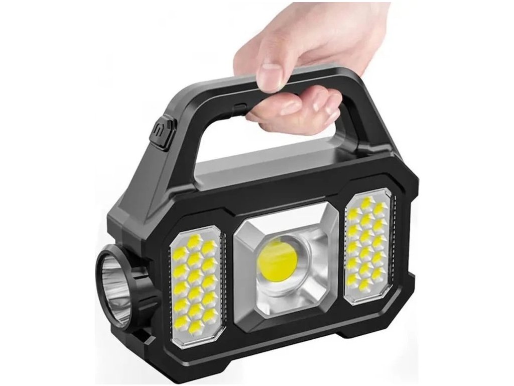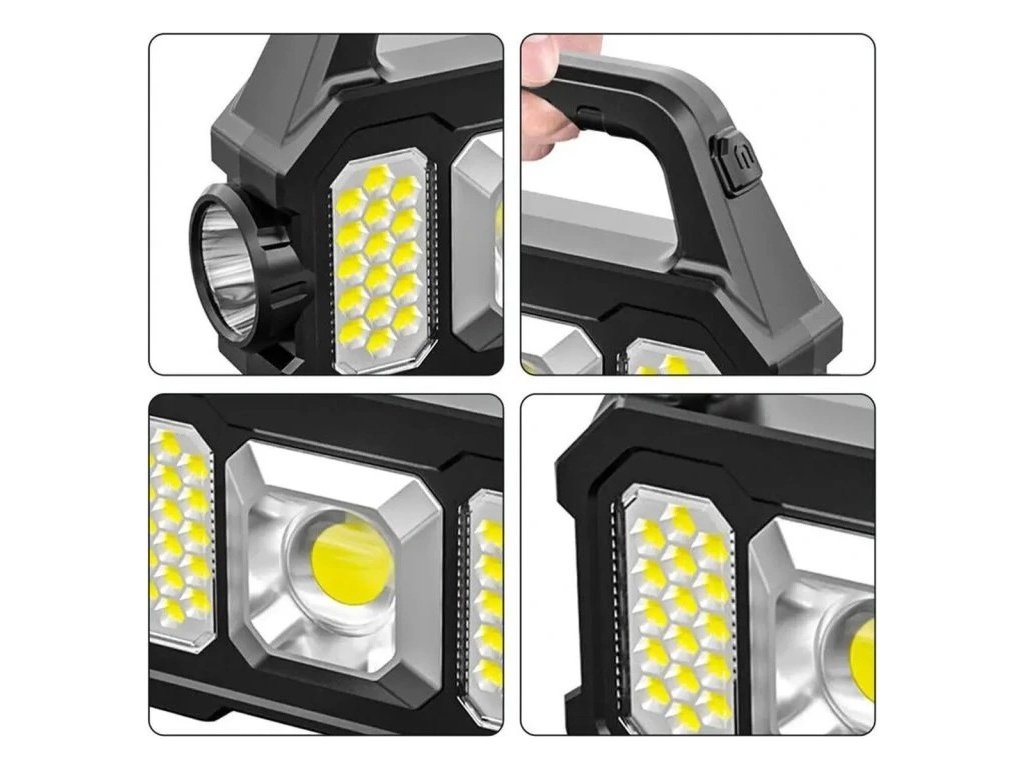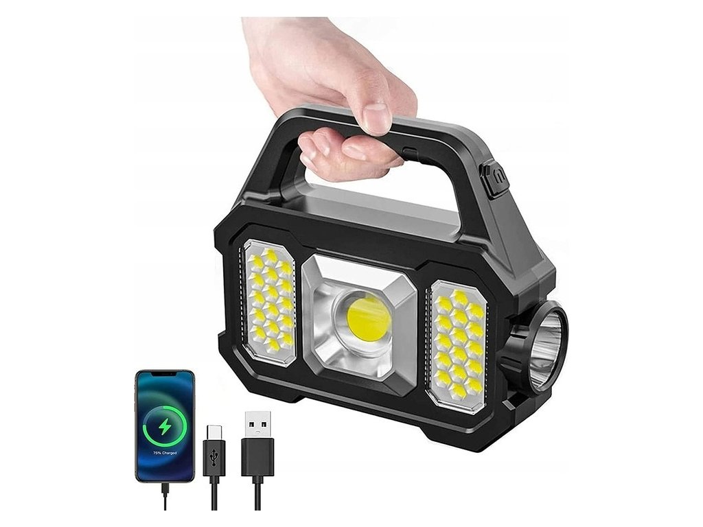 Ruční reflektor s 33 COB LED diodami na boční straně poskytuje osvětlení o jasu 500 lumenů. Přední vysoce svítivá LED T6. Na rukojeti je spínač, kterým se pohodlně zapínají světla. Nabíjecí konektor má vodotěsné a prachotěsné víko, které je obtížné poškodit a má delší životnost! Vodotěsný IPX4, nebojí se deště, je ideálním společníkem pro outdoorové aktivity!