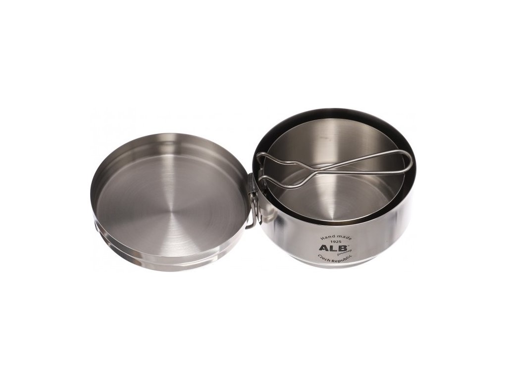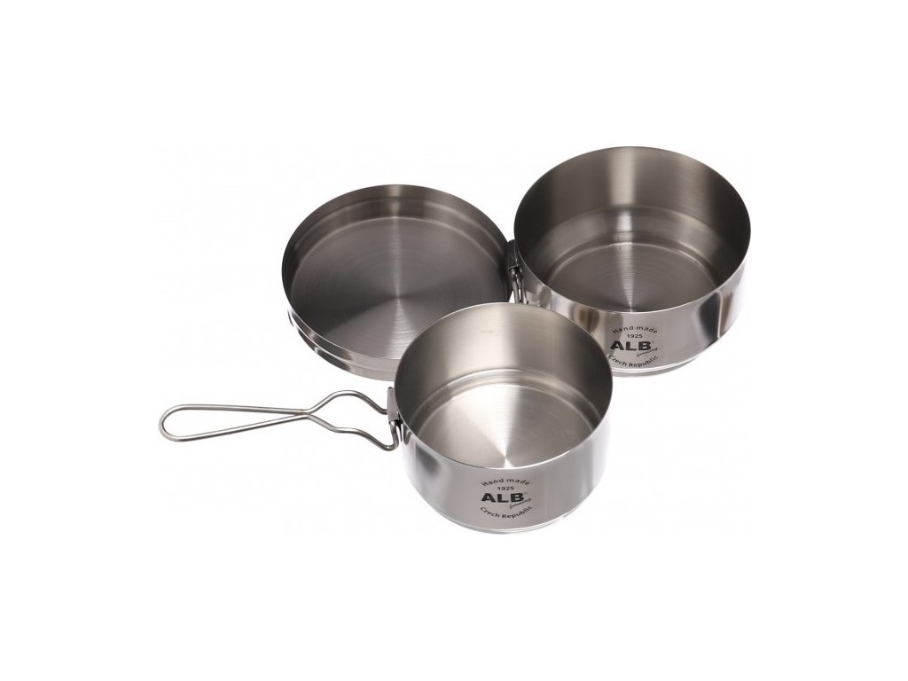 - Součástí jídelní sady je velký ešus se sklopnou rukojetí, malý ešus se sklopnou rukojetí, a poklička sloužící také jako praktická miska.