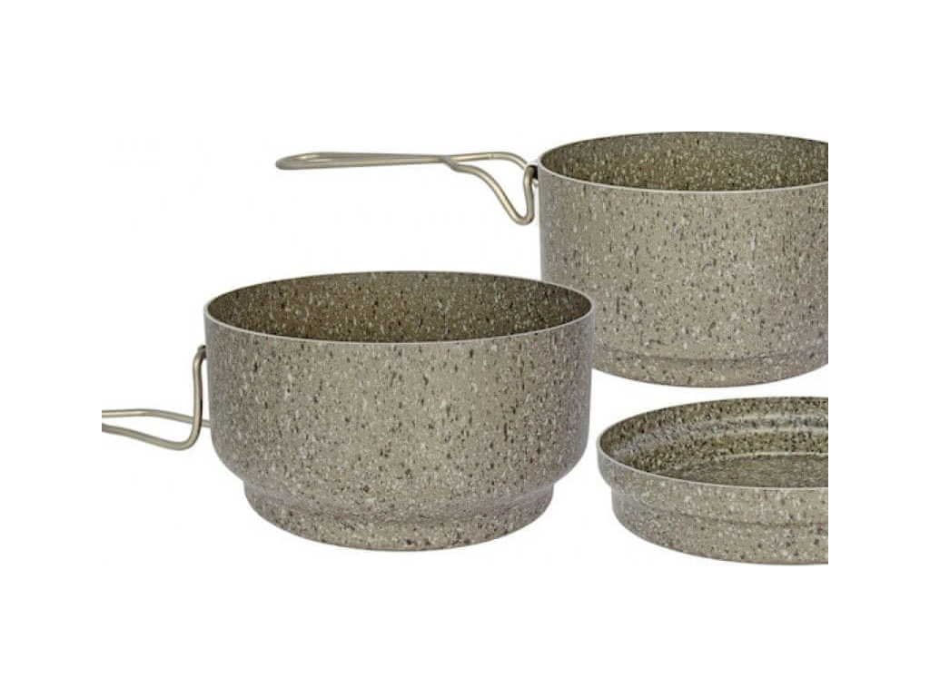 Moderní varianta klasického „armádního“ ešusu v kamenném designu STONE. Nádobí se skládá ze tří dílů (velká miska, malá miska, víčko). Sada je vyrobena z hliníku, který má po obou stranách tenkou vrstvu PTFE (tedy teflonu) a v designu kamene. Hlavní a nezpochybnitelnou předností PTFE je nenáročná údržba a pohodlné vaření – pokrm se snadno připraví a nepřipaluje. Skvělý jako parťák na cesty nebo perfektní dárek.