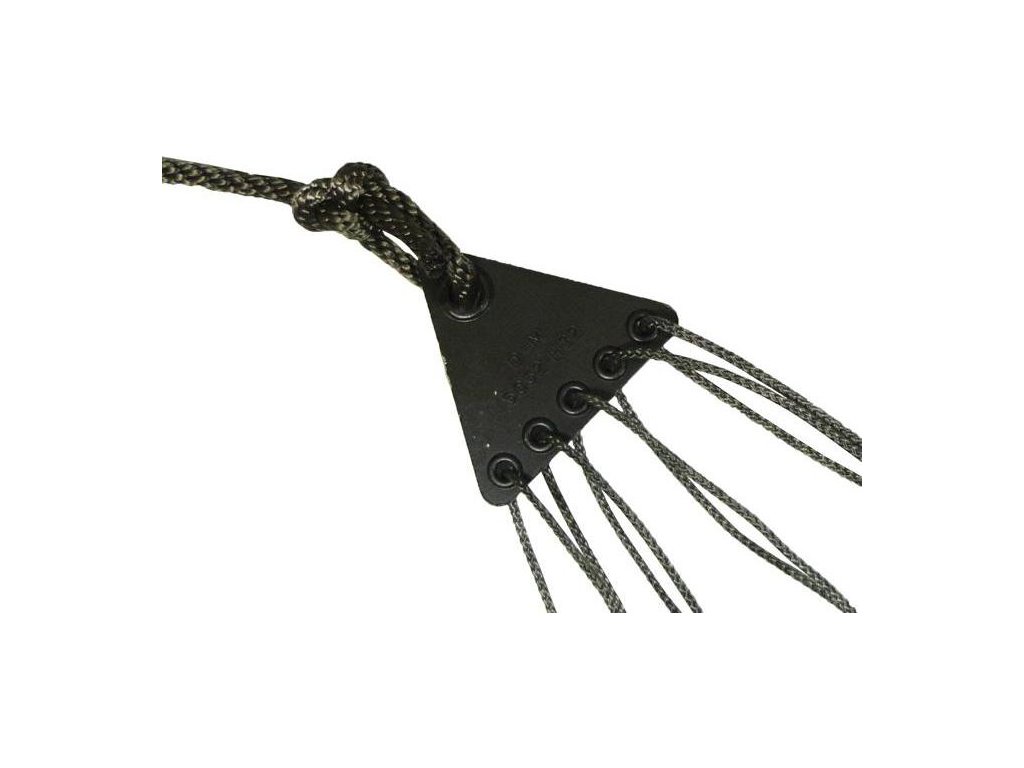 - kratší okraje základny jsou opatřeny šesti kovovými oky, ve kterých jsou provlečené nylonové šňůry spojené do kovového oka na zavěšení