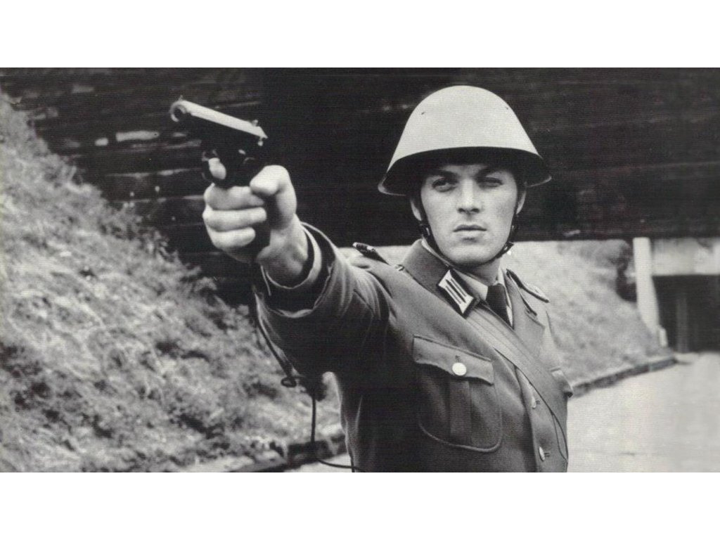 - Ocelová východoněmecká ochranná přilba ozbrojených sil východoněmecké armády.