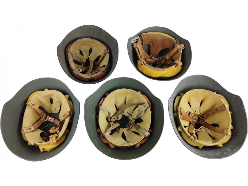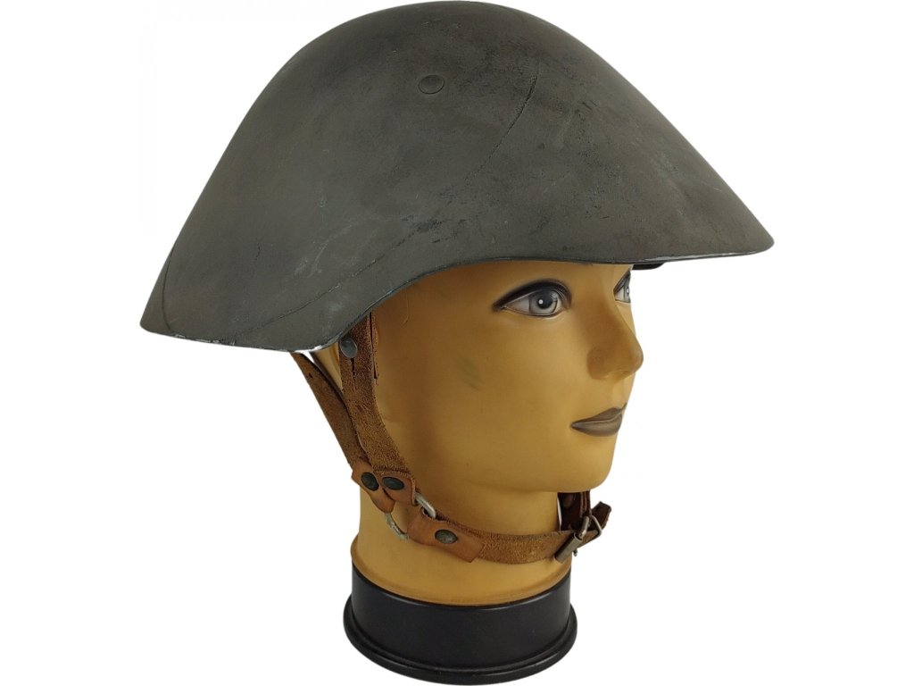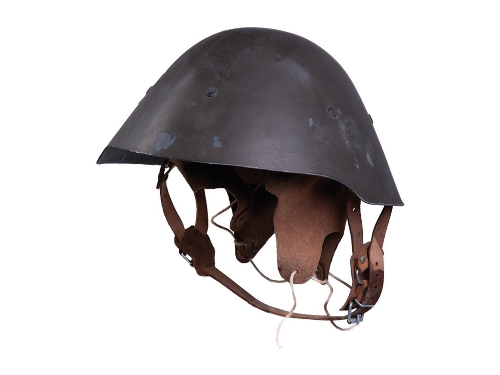 - Plastová přilba klenutého tvaru s prodlouženou ochranou uší, lakovaná šedo-zelenou barvou, a vybavená koženým podbradním páskem ve tvaru písmene „Y“ a perforovanou vložkou z jemné kůže s osmi jazyky.