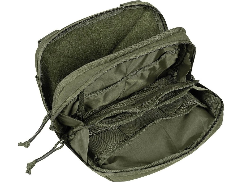 - Přední strana s kapsou na zip a zasouvací kapsou se suchým zipem a poutky MOLLE na vnější straně.