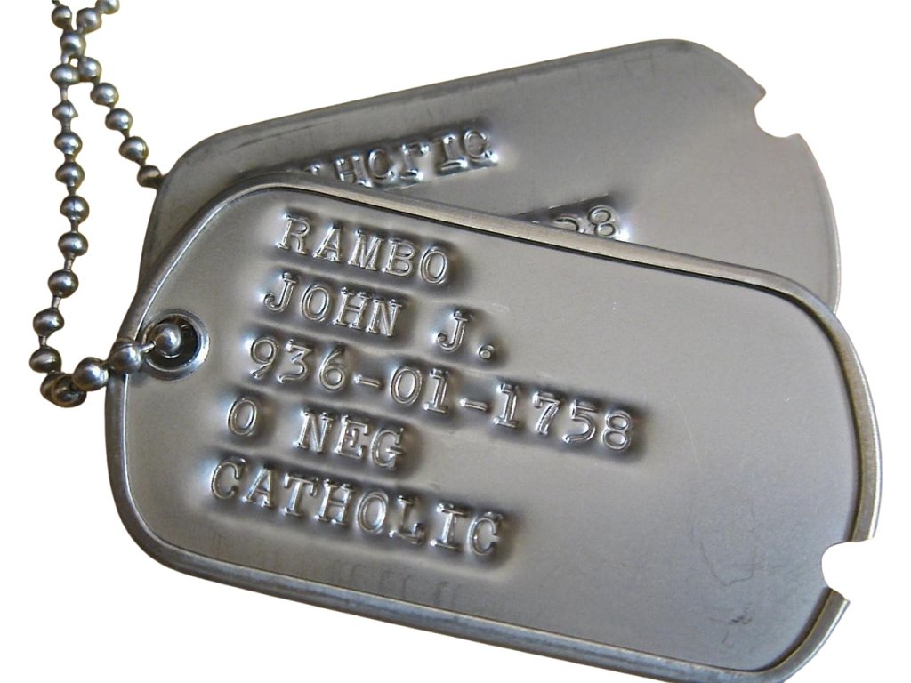 Jako jedni z mála v ČR razíme identifikační (psí) známky profesionálním americkým armádním razícím strojem. Zaručujeme tedy vysokou kvalitu a ražbu až 16 znaků na řádek (1. a 5. řádek 15 znaků). Na identifikační známku si samozřejmě můžete nechat vyrazit cokoliv, ne pouze údaje uvedené u jednotlivých řádků (vzor US ARMY)