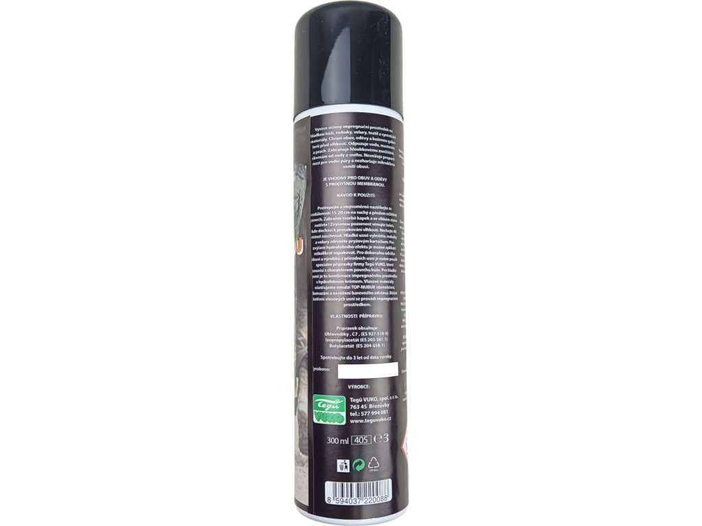 Vysoce účinný impregnační prostředek na hladkou kůži, nubuky, velury, textil a syntetické materiály. Chrání obuv, oděvy a koženou galanterii před vlhkostí. Odpuzuje vodu, mastnotu a prach. Zabraňuje hloubkovému znečištění, skvrnám od vody a sněhu. Nesnižuje propustnost pro vodní páry a nezhoršuje mikroklima uvnitř obuvi.