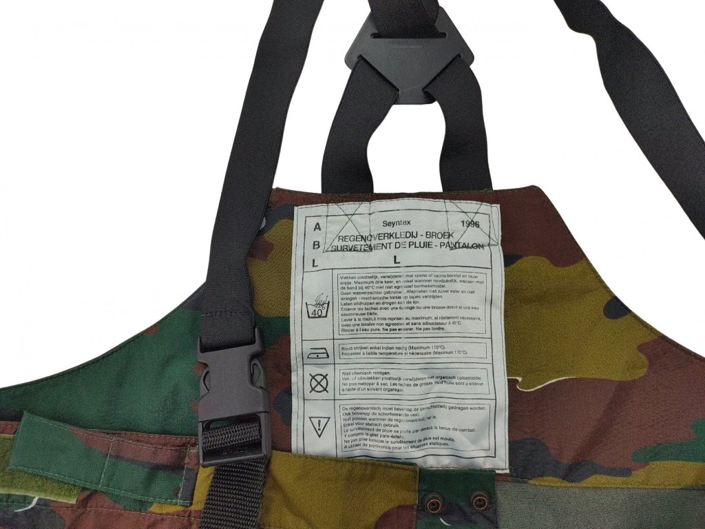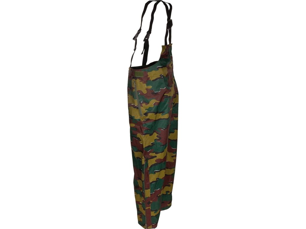 Originální laclové kalhoty s kšandami nepromokavého oděvu belgického vojáka pozemních ozbrojených sil. Vyrobeny ze 100% nepromokavého materiálu s membránou, speciálně navrženého tak, aby byl vodotěsný a odolný proti větru, a přesto prodyšný. Ve "skládačkové" maskovací kamufláži Jigsaw Camouflage.