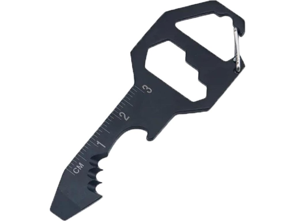- Praktická kovová klíčenka s nářadím ve tvaru klíče.