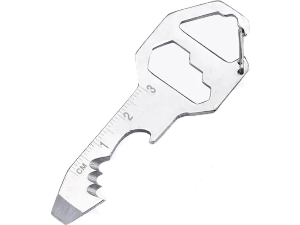 - Praktická kovová klíčenka s nářadím ve tvaru klíče.