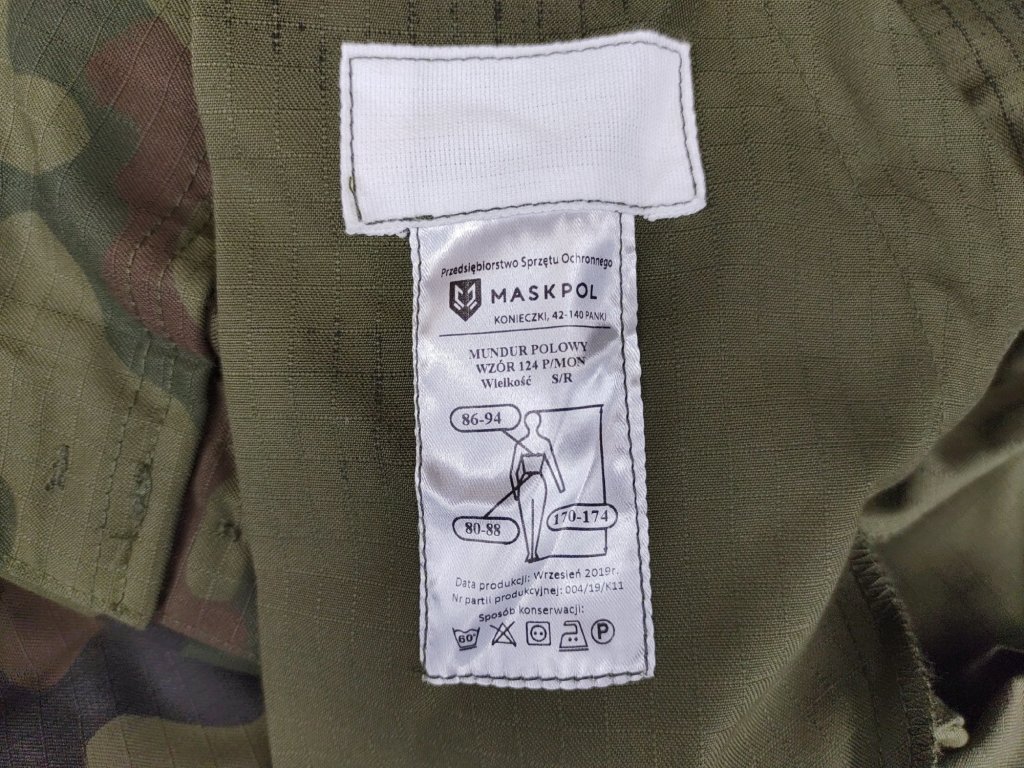 P/MON:Označení pro "Polowy/Materiál Obrony Narodowej", což znamená "Polní/Materiál Národní Obrany". Toto označení specifikuje, že se jedná o polní uniformu určenou pro bojové operace a je vyrobena z materiálů vhodných pro tento účel.
