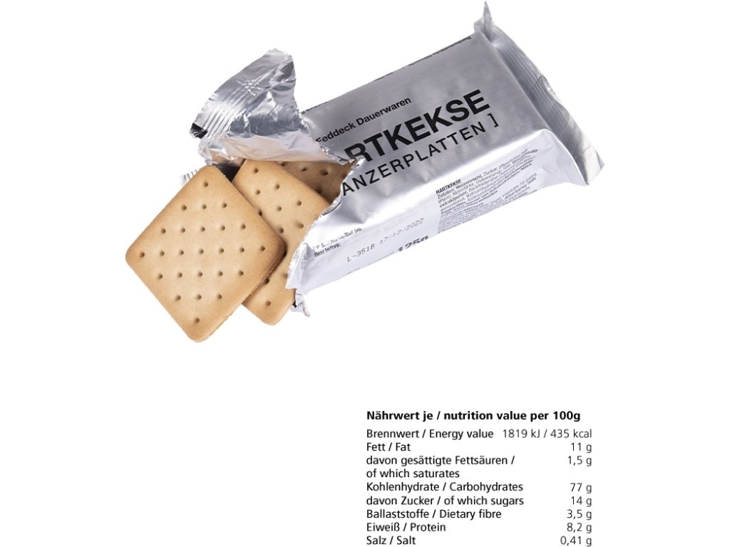 - receptura a balení činí sušenky velmi trvanlivými a odolnými vůči vlhkosti, teplu, chladu a hlodavcům