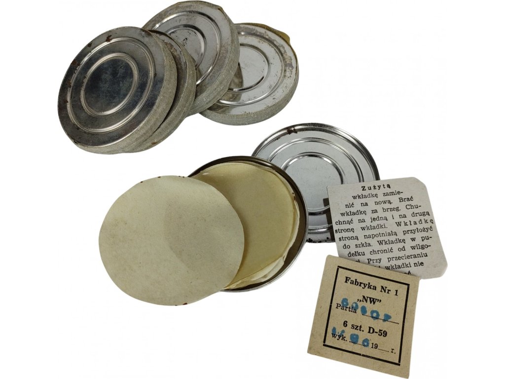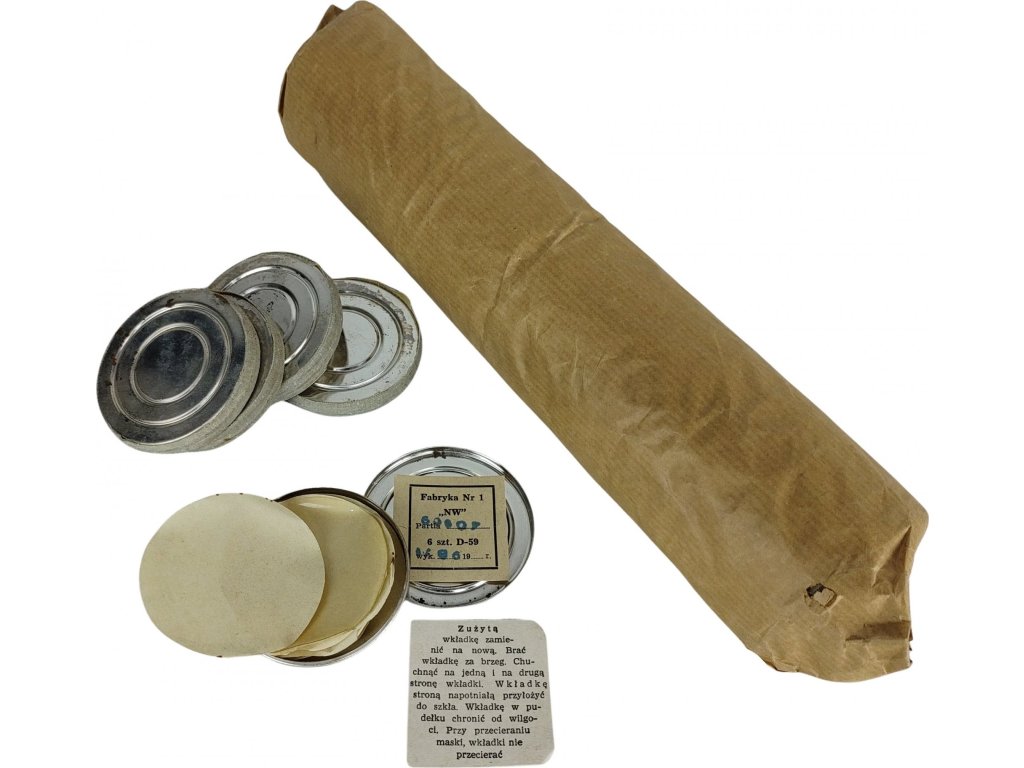 - Plechové balení obsahující 6 ks průhledných krytek na očnice plynové masky (3 sady).